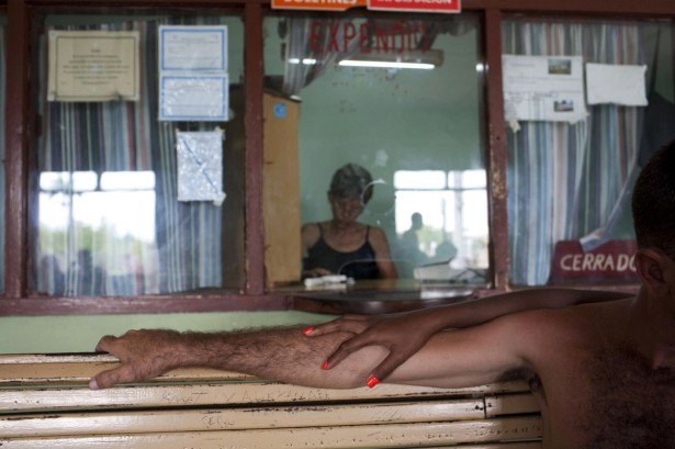 A young couple heading back to Havana after a day at the beach waits to board the train at the Matanzas station.
